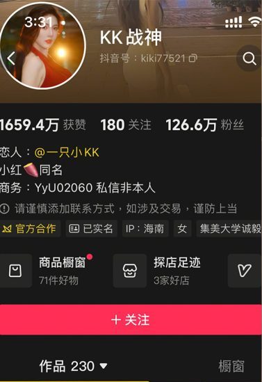 作为时尚美妆领域的创作者,KK 战神确实很懂 Z 世代的审美,# 变装、# 椰树 这些标签的作品经常能上热门榜单。现在她也有了完整的商业化路径,商务联系是 YyU02060,而且小红书上也有同名账号,一直在拓展内容影响力。值得一提的是,她账号里还温馨提示 “私信非本人”,还标注了恋人账号 @一只小 KK,没有刻意营造完美人设,反而显得更真实立体,让人觉得不是单纯的 “内容机器”。