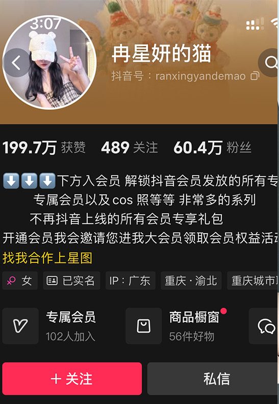 在抖音的颜值赛道里,想杀出重围可不容易。但来自重庆渝北的「冉星妍的猫」(抖音号:Ranyunxi11)却玩得风生水起。这位IP属地显示在广东的元气少女,硬是靠着独特的甜美风格,在西南地区构建起了自己的影响力矩阵,目前坐拥58.8万粉丝,累计获赞高达257.8万次。