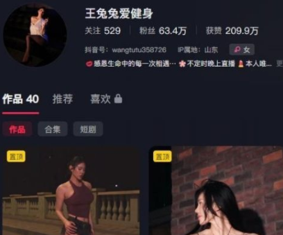 目前坐拥63.4万粉丝和209.9万点赞的王兔兔,其实只发布了40个作品。这个来自山东的健身博主,用“感恩生命中的每一次相遇,不定时晚上直播”作为简介,保持着一种随性却真诚的更新节奏。