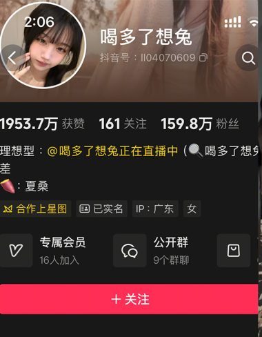 看到”喝多了想兔”的抖音主页时——齐刘海长发的清秀女孩,配上”男孩子的快乐”这句简介,这个广东女孩在抖音上已经积累了119.6万粉丝,951.2万的点赞数也证明了她内容的受欢迎程度。