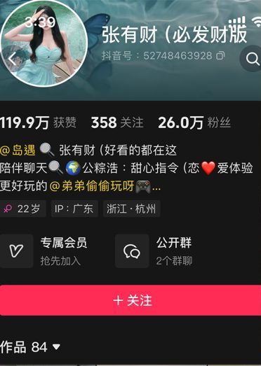 抖音网红「张有财(必发财版)」,账号是52748463928 的创作者,其实是个才 22 岁的广东姑娘,现在定居在杭州。在生活时尚这个赛道,能像她这样既保持高质量更新又能维持高人气的创作者,确实不多见。靠着独一份的性感叙事风格,在平台上攒了 27.5 万粉丝,累计获赞都超过 130.5 万了,实打实的小有名气。