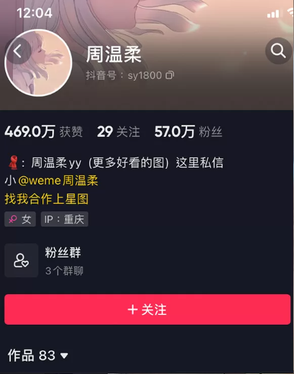 家人们,今天又挖到一位宝藏颜值博主,就是周温柔!她的抖音号是wr8889,江苏泰州人,妥妥的00后小姑娘,今年才20岁,身高166cm,往那一站,气质直接拉满。说真的,她能在抖音迅速火起来,完全靠的是“纯欲天花板”级别的颜值,再加上反差感拉满的穿搭,现在已经坐拥60.7万粉丝,作品累计获赞都超729万次了,实力真的不容小觑。