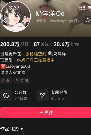 喜欢软萌卡通风的,大概率刷到过奶洋洋Oo,这位四川姑娘的抖音账号是0v0xiaoyango,不走常规颜值路线,专门靠动漫、卡通风格的作品圈粉,光看她的头像和简介,就能get到她独一份的创作调性,辨识度直接拉满。