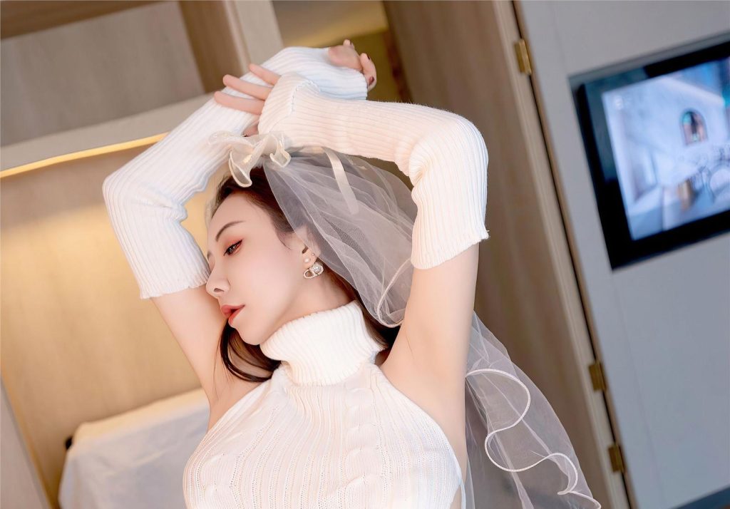 白色系造型是这场视觉盛宴的基底,却绝非单调的叠加。抹胸设计精准贴合肩颈线条,在锁骨凹陷处盛满柔和光影,手工缝制的蕾丝边缘暗藏精致肌理,与婚纱裙摆的层叠薄纱形成材质对话。0.03 毫米的超薄白色丝袜如第二层肌肤,既勾勒出腿部流畅的肌肉线条,又在灯光下泛着珍珠母贝般的细腻光泽,让大长腿在视觉上无限延伸。整套造型以极简色彩为画布,将果儿 Victoria 的身材优势发挥到极致,腰臀的自然起伏与裙摆的蓬松感形成动静对比,每一处褶皱都藏着精心设计的韵律。