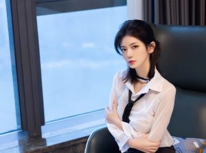 场景定格在光线柔和的公司办公室,午后阳光透过百叶窗,在桌面与地面投下斑驳光影,简约的办公桌、黑色皮质办公椅,搭配散落的文件与笔记本电脑,还原出最真实的职场氛围。凌七七端坐于椅子中央,身姿挺拔却不僵硬,恰好将这套穿搭的精髓展现得淋漓尽致。上身的白色衬衫剪裁得体,棉质面料带着细腻光泽,领口微敞露出精致锁骨,袖口轻轻挽至小臂,既保留了职场着装的端庄,又多了几分不经意的松弛感。衬衫下摆利落扎进高腰西装短裙,瞬间拉长身形比例,黑色短裙的修身版型勾勒出曼妙腰臀曲线,长度恰到好处,行走间自带飒爽气场。