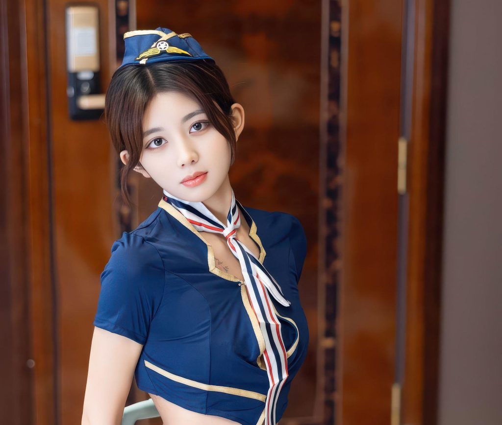 整套写真最迷人的地方,就是她身上强烈的反差感。明明穿着成熟精致的空姐制服,自带优雅知性的气场,可脸蛋却是满满的少女感,娃娃脸清纯稚嫩,像刚进校园的大学生,干净又阳光。盘发显端庄,黑丝添妩媚,可五官依旧清甜软嫩,两种截然不同的风格在她身上完美融合,既纯又欲,越看越有味道。